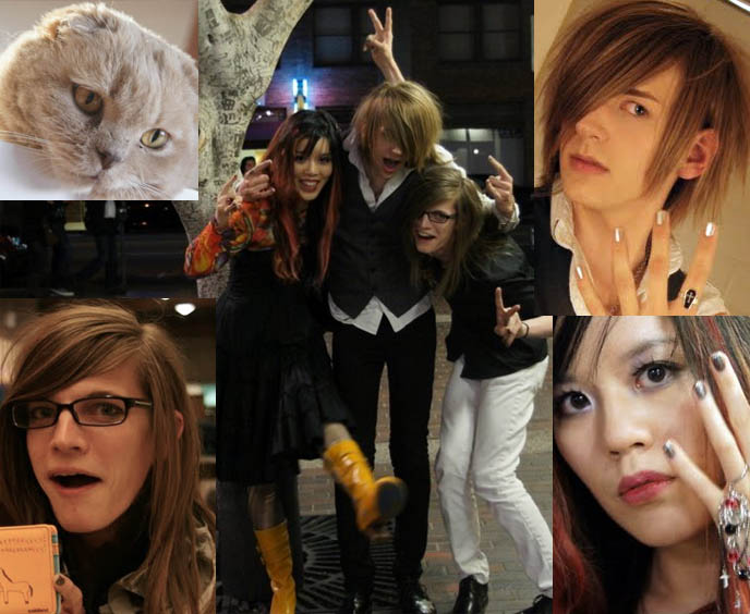 La Carmina and Visual Kei boys, cute emo teens, visual kei hair, yellow John Fluevog boots, gothic lolita rainbow dress and top, scottish fold cat cute face, small folded ears kitten, red lipstick and fake eyelashes, japanese cute kawaii girls makeup, gal or gyaru street style Harajuku, goth aristocrat mens fashion