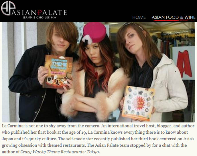 La Carmina is not one to shy away from the camera. An international travel host, blogger, and author who published her first book at the age of 19, La Carmina knows everything there is to know about Japan and it’s quirky culture. The self-made star recently published her third book centered on Asia’s growing obsession with themed restaurants. The Asian Palate team stopped by for a chat with the author of Crazy Wacky Theme Restaurants: Tokyo.
